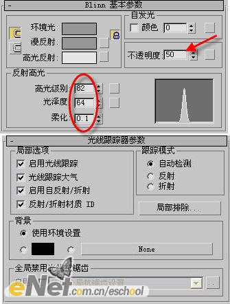 4、選擇第三個(gè)材質(zhì)球,為其指定一種玻璃材質(zhì),打開(kāi)“blinn 基本參數(shù)”卷展欄,修改其高光級(jí)別,并打開(kāi)“貼圖”卷展欄,為“折射”指定一光線(xiàn)跟蹤貼圖,如圖5所示,將該材質(zhì)賦予teapot03。