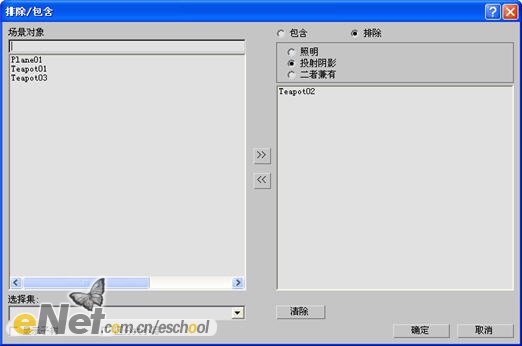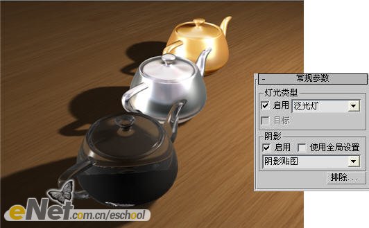 3、打開(kāi)“常規(guī)參數(shù)”卷展欄,在陰影欄下的列表中選擇“光線(xiàn)跟蹤陰影”項(xiàng),單擊“排除”按鈕,打開(kāi)其窗口,將此茶壺添加到右邊列表中,點(diǎn)擊確定。從而此茶壺不會(huì)產(chǎn)生任何陰影。如圖8所示。
