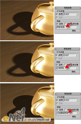 小提示:區(qū)域陰影能夠產(chǎn)生柔和的半影及陰影過(guò)渡效果;光線(xiàn)跟蹤陰影是根據(jù)光影跟蹤的方式產(chǎn)生陰影,具有精確性,對(duì)于半透明和透明的材質(zhì)能產(chǎn)生真實(shí)的陰影效果。