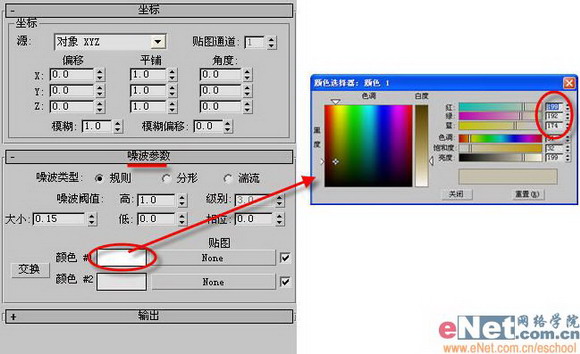 2、單擊“貼圖”后的“none”按鈕,打開“材質/貼圖瀏覽器”屬性窗口,選擇“新建”單選框,然后在右邊列表中雙擊“噪波”貼圖,并修改其參數。如圖3所示。