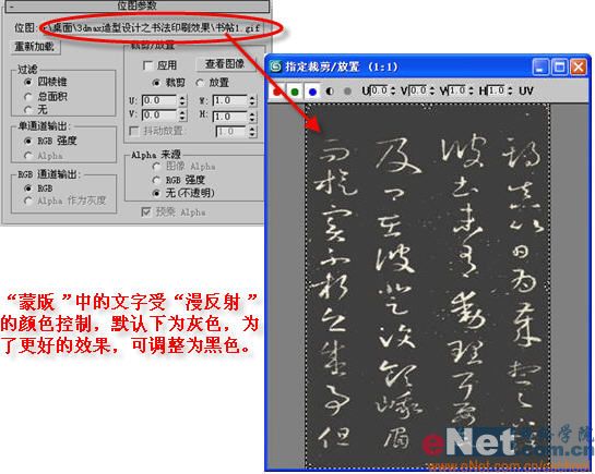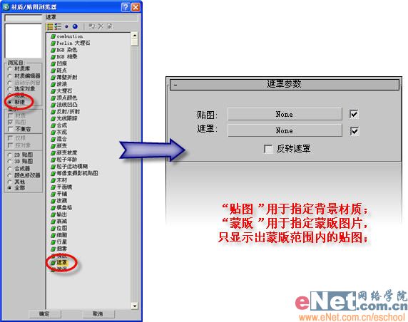 3、點擊“轉到父對象”按鈕,回到“遮罩”參數面板,點擊“蒙版”后面的“none”按鈕,在打開的“材質/貼圖瀏覽器”中選擇“新建”單選框,然后在在右邊列表中雙擊“位圖”貼圖,在彈出的窗口中指定相關書法圖片,如圖4所示。