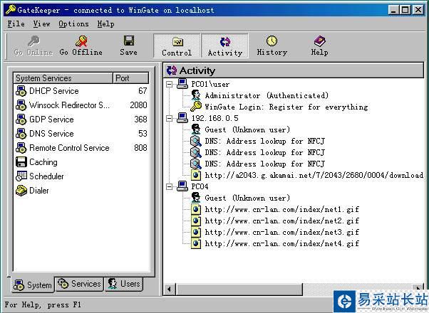 第四步:進入wingate管理窗口(604.jpg),第一次進入時,計算機會提示你修改管理員密碼。左邊是wingate開放的服務類型,右邊是對各工作站上網進行監測。