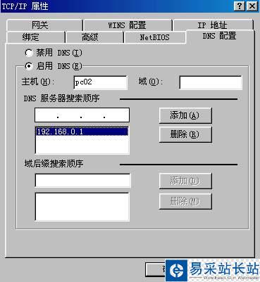 第二步:設置DNS。啟用DNS,輸入主機名為本機臺,域可以不填,DNS服務器搜索順序填寫為代理上網服務器主機,在這里是192.168.0.1 或者是當地的ISP服務器的IP地址,比如在長沙是202.103.96.111。按添加。(圖605.jpg)