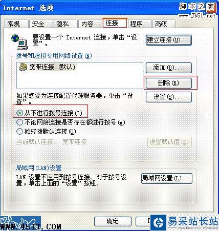 3、如果是撥號(hào)上網(wǎng)的用戶(hù),請(qǐng)先刪除寬帶的撥號(hào)連接,并選擇"從不進(jìn)行撥號(hào)連接" 。點(diǎn)擊瀏覽器里面的工具---Internet選項(xiàng)----連接,如下圖: