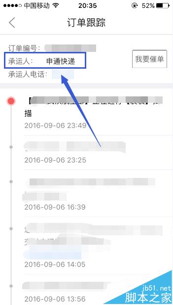 3、最后會彈出“訂單跟蹤”頁面,在此頁面的上方我們就能看到承運人了。