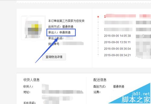 4、最后在“訂單詳情”頁面的收貨人信息欄上方我們就能看到承運人是哪個單位承運了。