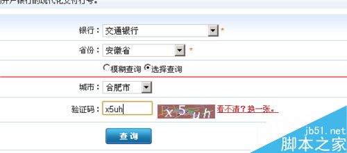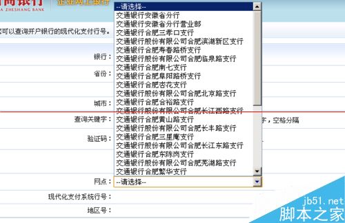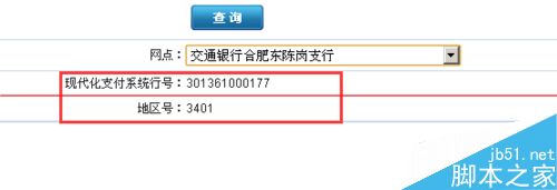 5、輸入自己銀行卡所在網點的基本信息去查詢。我們先輸入好銀行、省份、地區和驗證碼,然后點擊查詢。在網點中就會出現該銀行在該地區所有的網點,我們選擇我們所要找的網點,在“現代化支付系統行號”一欄就是我們要找的“聯行號”了