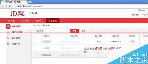 9、網站認證結束,我們回到網站管理頁面,頁面中會出現剛剛添加的網站,狀態為“審核中”,我們等待京東的人員審核即可。