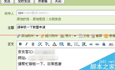 11、我們打開郵箱,給京東的管理人員寫封郵件,收件人為“cps@jd.com”,具體內容請童鞋們看圖,其中京東ID,在賬戶信息中查找,網站就是剛剛童鞋們所申請的網站。