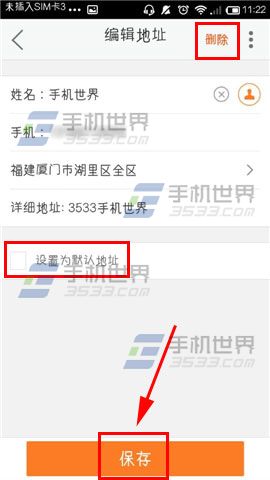 3)點擊地址右邊的【鉛筆】圖標,可以編輯地址,右上角可刪除,也可以設置為默認地址,記得修改好后要點擊【保存】哦。