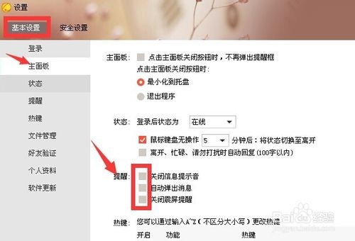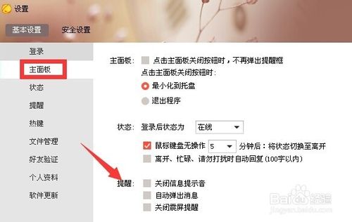 4、在其下選擇”提醒。分別在“關閉信息 提示音“”自動彈出消息“”關閉震屏提醒“前打勾。