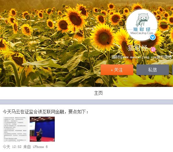 據(jù)網(wǎng)絡(luò)媒體貓財(cái)經(jīng)微博報(bào)道,今日(10日)證監(jiān)會(huì)邀請(qǐng)阿里巴巴集團(tuán)主席馬云講解互聯(lián)網(wǎng)金融。馬云肯定微信并表示要為微信豎大拇指。今日證監(jiān)會(huì)邀請(qǐng)馬云講互聯(lián)網(wǎng)金融,演講要點(diǎn)如下。