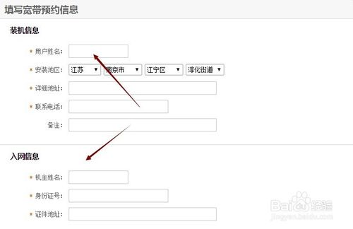 7、在填寫寬帶預約信息頁面,輸入你的裝機信息的用戶姓名和安裝地址,聯系電話,同時還要輸入入網信息,如下圖所示。