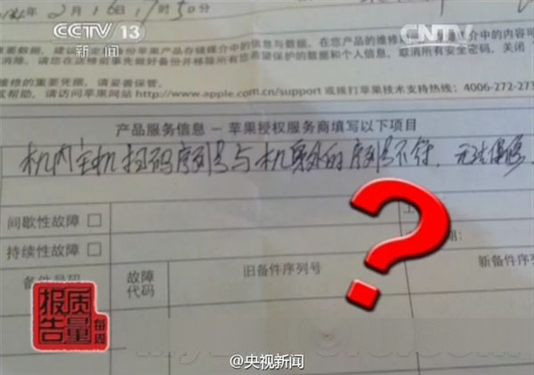 隨后,吳女士并沒有辦理換貨,而是在蘋果的一個維修中心檢修,檢修發現機內主機掃碼序列號與機身外的序列號不符。蘋果官方客服表示,這臺機器三個碼都不一樣,或是被改裝過。