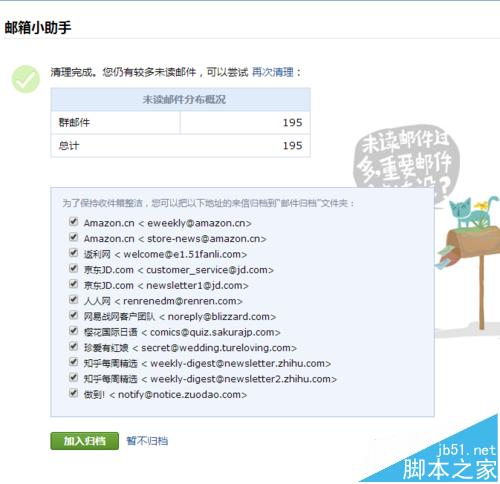 5、先標記好,下一步就是讓你歸檔,什么意思呢?就是將你選中的這些統一歸到垃圾郵件中,這樣,打開就不會全是京東了。。。