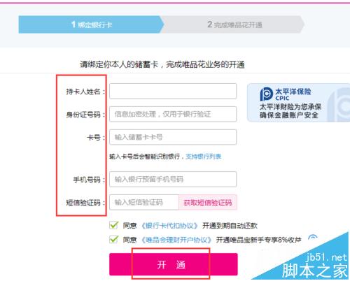 3、根據唯品會給的填寫信息,填寫內容,點擊“開通”即可。