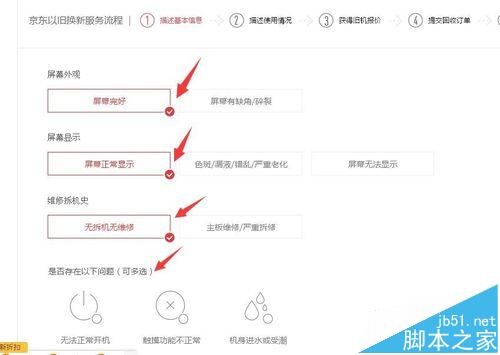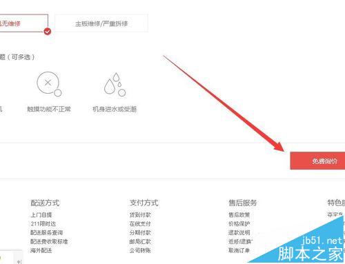 3、在接下來的界面中根據(jù)您手機(jī)的具體狀況,根據(jù)屏幕外觀是否完好、屏幕顯示是否正常、有無拆維修機(jī)史選擇相應(yīng)的選項,然后點按免費(fèi)詢價按鈕,此時就可以查看該手機(jī)目前的回收價格,如果想立刻回收舊點擊立即回收,如果想先保存起來可以點擊加入回收車。