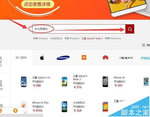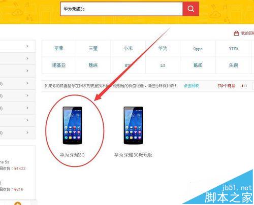 2、此時界面轉(zhuǎn)入以舊換新界面,在空白框中輸入手機(jī)品牌及型號,然后點按搜索按鈕,如果型號有細(xì)分型號,選中一種您手機(jī)對應(yīng)的細(xì)分型號,如下圖所示,