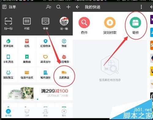 5、為了能夠快捷完成郵寄,我將通過手機(jī)支付寶提供的功能郵寄,打開手機(jī)支付寶,然后點按我的快遞按鈕。