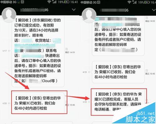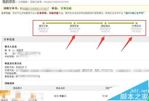 9、當(dāng)手機(jī)郵寄到后會收到短信提醒,提示您手機(jī)將在48小時之內(nèi)檢測,等待檢測結(jié)束之后會提示質(zhì)檢完成,等收到客服電話后再次登錄京東手機(jī)以舊換新界面可以查看到訂單已經(jīng)完成了質(zhì)檢完成、交易成功步驟,如果下面的詢價項目和實際檢測結(jié)果項目可以按原評估價成交。