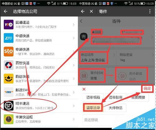 6、然后界面會進(jìn)入我的快遞界面,選擇寄件按鈕,然后界面會跳轉(zhuǎn)到選擇物流公司界面,點選一家物流公司,然后進(jìn)入寄件界面,在此輸入寄件人電話及地址,然后輸入寄送城市,寄送時間選擇現(xiàn)在,然后點按對小哥說,在此手動輸入一些需要特別注意的事項或者直接點按已有的選項,然后點按確定。