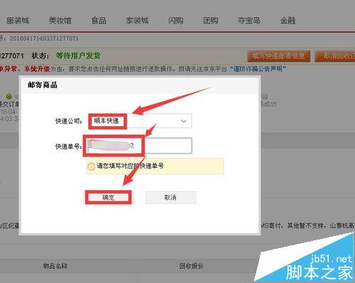 7、此時稍等片刻就會有快遞打電話給你并問你是否在家,如果在家快遞將安排人員馬上來取貨,此時只需將手機(jī)安裝上充滿電的電池,然后關(guān)機(jī),其他的配件都不需要郵寄回去,并將手機(jī)最好裝入原裝包裝盒內(nèi),等待快遞人員上門取件,快遞人員上門取件時會驗貨,然后填寫運(yùn)單,選擇到付即可,此時返回京東回收訂單詳情界面,然后點按填寫快遞郵寄信息按鈕,然后在接下來的對話框中選擇快遞公司,然后輸入快遞單號,然后點按確定。