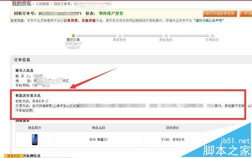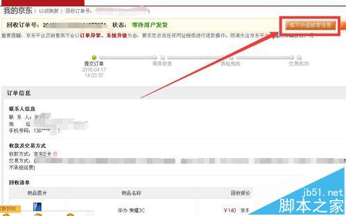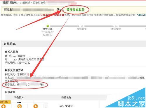 8、此時的回收訂單的狀態(tài)已經(jīng)變?yōu)榈却碳沂肇浟?,并且郵寄信息已經(jīng)更新為剛才添加的信息,此時只需等待手機(jī)郵寄到后檢測結(jié)果與之前提交的結(jié)果相符即可獲得回收收入。