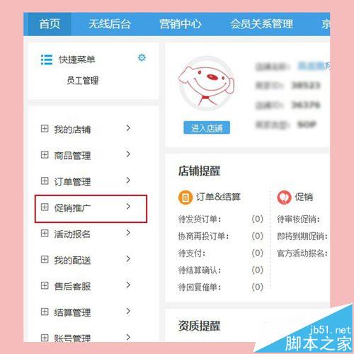 2、在進入的后臺頁面的左側選擇“促銷推廣”;