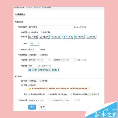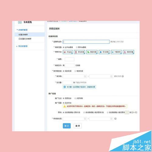 6、填寫店鋪券名稱、適用范圍等信息并提交,如圖所示;