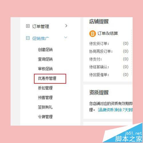 3、在促銷推廣的下拉列表中選擇“優惠券管理”;