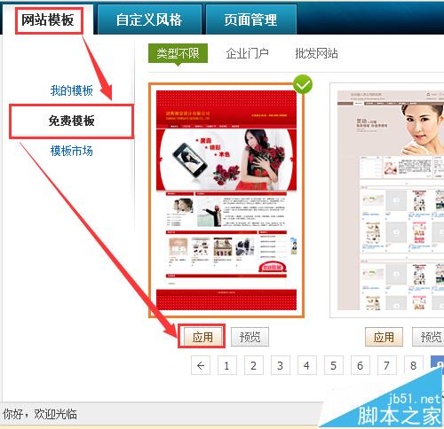 3、【網(wǎng)站模板】——【免費模板】,選擇一款模板適合自己行業(yè)的就好,本次演示選擇一個紅色系的,點擊模板【應(yīng)用】。