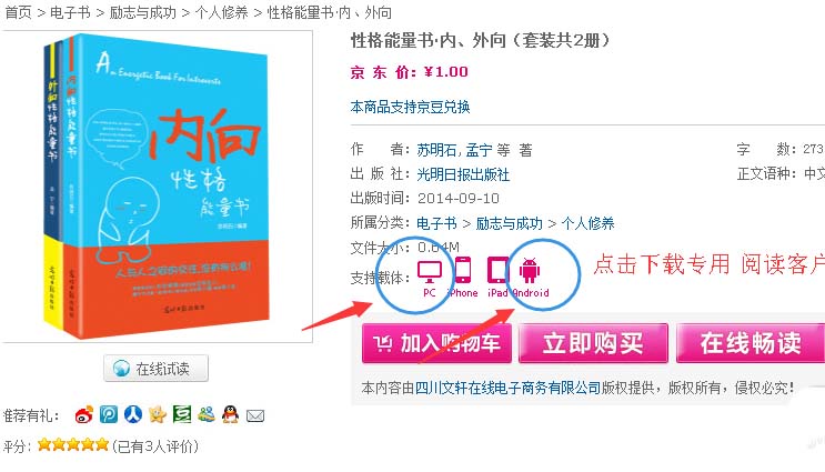 4、接著,回到 剛才的商品詳情頁面,因為需要專門的閱讀器才能閱讀所購買的電子書籍,所以還要下載一個閱讀的客戶端(這里提供PC、iPhone、iPad和Android四種閱讀載體),這里選擇下載PC版 的和 Android版的,如下圖所示