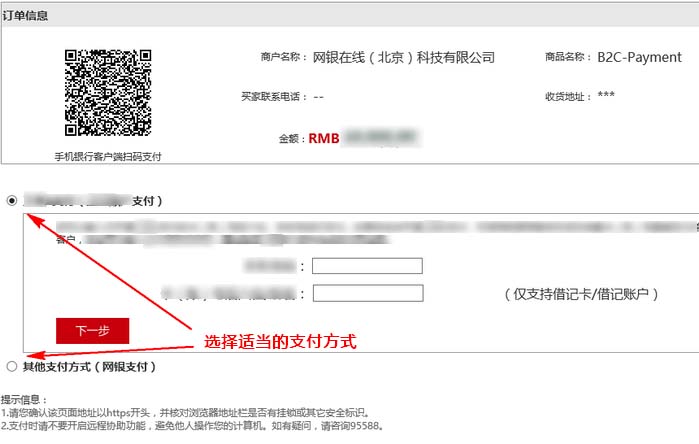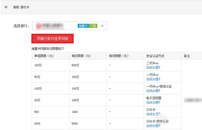 7、在網銀支付頁面,請根據你的銀行卡的實際情況選擇相應的支付方式。