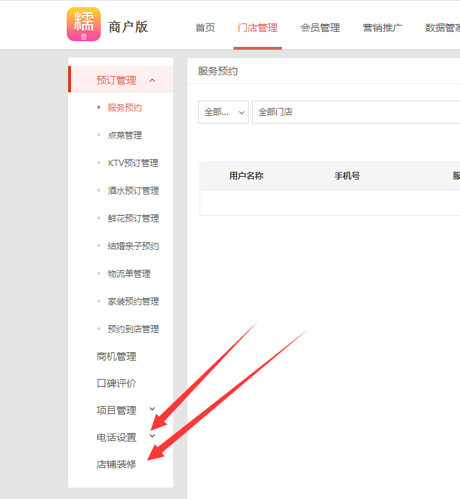 2、在門店管理的左側有電話設置和店鋪裝修,如圖所示。