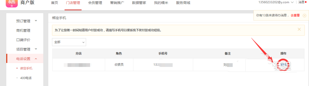 3、點擊電話設置,可以重新設置綁定商家賬戶的接收短信提醒的手機號碼。如圖所示,點擊編輯。
