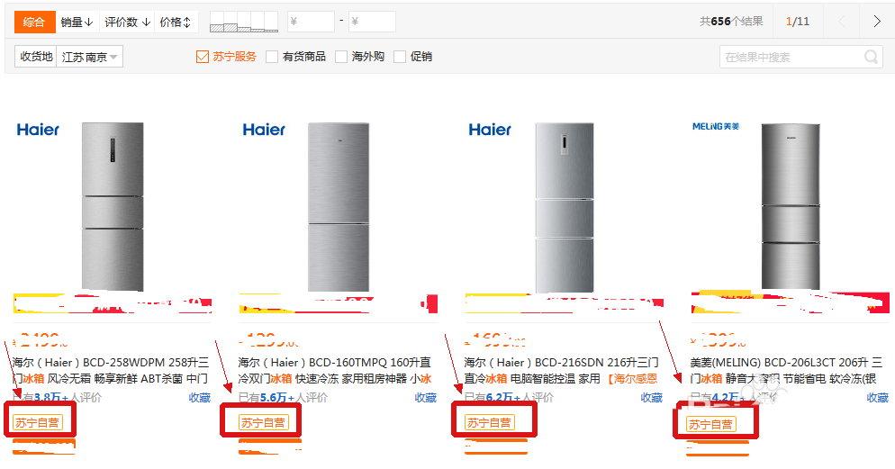 3、此時下方商品展示區展示的即為 蘇寧自營商品,挑選商品上明確標識自營的商品。