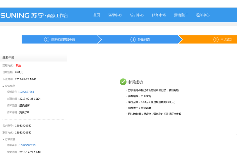 先行賠付功能是由 客服主動發起,蘇寧先行墊付賠付金額,再由商家審核先行賠付單,確認是否同意賠付,若同意則直接從商家賬戶扣除響應金額,若不同意商家可以發起申訴,申訴成功則該筆賠付金由蘇寧承擔,申訴失敗從商家保證金中扣除