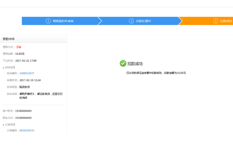 若商家申訴失敗,則代表該筆賠付單金額會從商家保證金中強行扣除,商家需要在規定時間內補充保證金,否則會接收到保證金超時未補繳的處罰措施