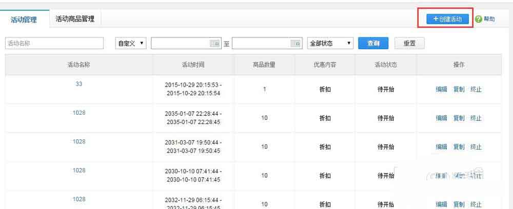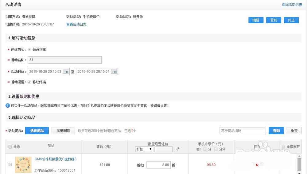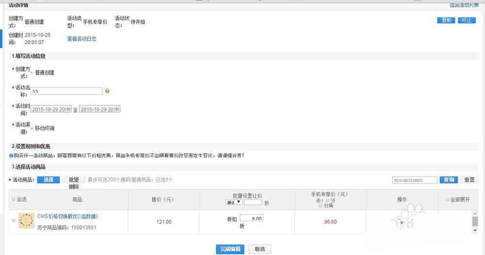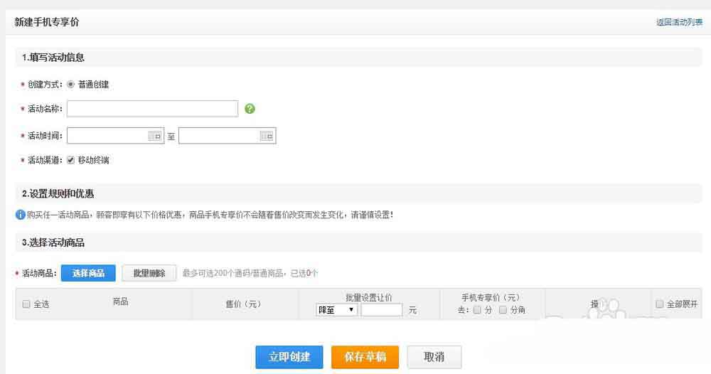 2、點擊營銷活動導航頁活動的【馬上創建】按鈕或活動管理頁面的【創建活動】按鈕,進入手機專享價的活動創建頁面