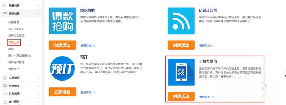 1、進入商家平臺,營銷管理-營銷工具,進入營銷活動導航頁面,如下圖: