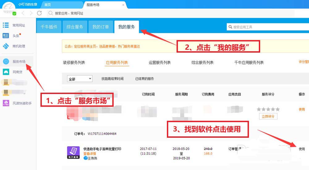 1、打開阿里巴巴千牛工作臺,進入賣家服務我的服務,點使用進入軟件