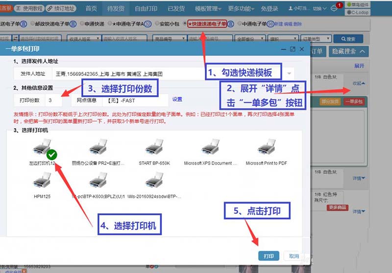 2、找到要打印的訂單勾選點打印,點擊打印快遞單,一單多包畫勾選擇分數點打印,打印完了之后,等快遞單出來之后點擊批量發貨就可以完成發貨 。