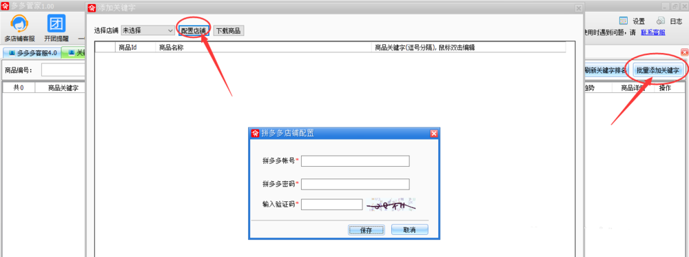 2、點(diǎn)擊批量添加關(guān)鍵字按鈕-----點(diǎn)擊配置網(wǎng)店按鈕----輸入拼多多賬號(hào)和密碼配置好拼多多網(wǎng)店