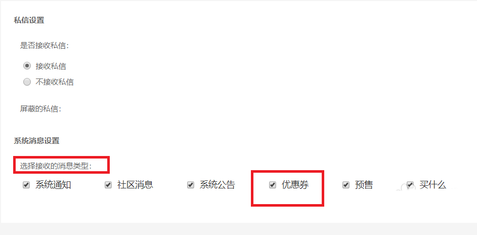 5、在設置頁面的最后一行,我們可以看到多個選項的設置,其中就有優惠券的提示,默認是勾選上的,如下面圖中所示。