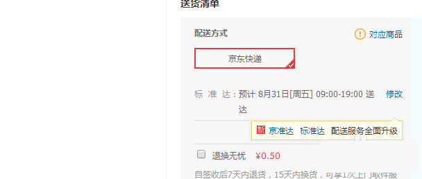3、如果在配送方式?jīng)]有出現(xiàn)退換無(wú)憂的話,先刷新一下,會(huì)彈出來(lái)的,如圖所示