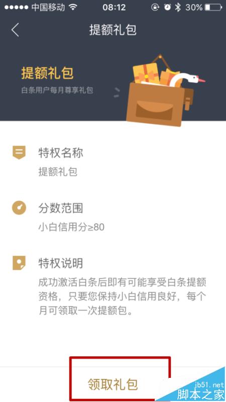 5、接下來,在提額禮包里面點擊最下方的“領取禮包”,當你領取之后,會出現恭喜提額成功的提示,而且也會顯示你的白條提升至多少。