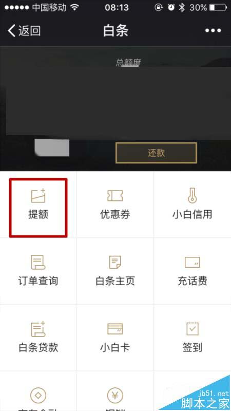 2、接下來,你在白條頁面會看到有提額標志,點擊“提額”;