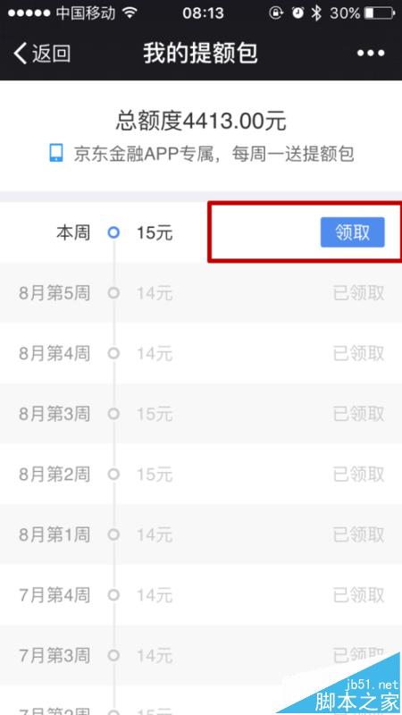 3、接下來,會有本周的額度出現,一周會提升一次額度,如果超過時間不領取,就會失效的,領取之后,會顯示已領取的,隨之變成白色。