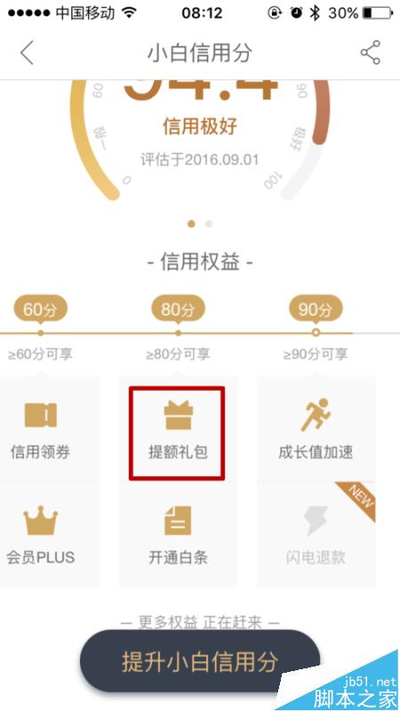 4、在小白信用分頁面點擊提額禮包,提額禮包在下方位置,找到之后點擊;