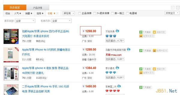 參考2:可以參考目前淘寶網(wǎng)上同行的賣家價格上的設(shè)置.在淘寶搜索欄里以“手機4s”為關(guān)鍵詞搜索為例,按照價格排序可以看到這個關(guān)鍵字最低價是:1298元,如圖: